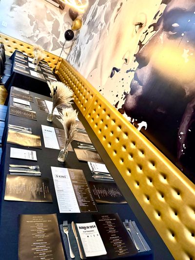 The King Room is a fully private room located on the second floor, furnished with a custom round and rectangle table built to accommodate ideal for social events, holiday events, or corporate meetings. Built-in A/V and 80” TV screens, the room is versatile enough for a cocktail reception, viewing party, or seated dinner.